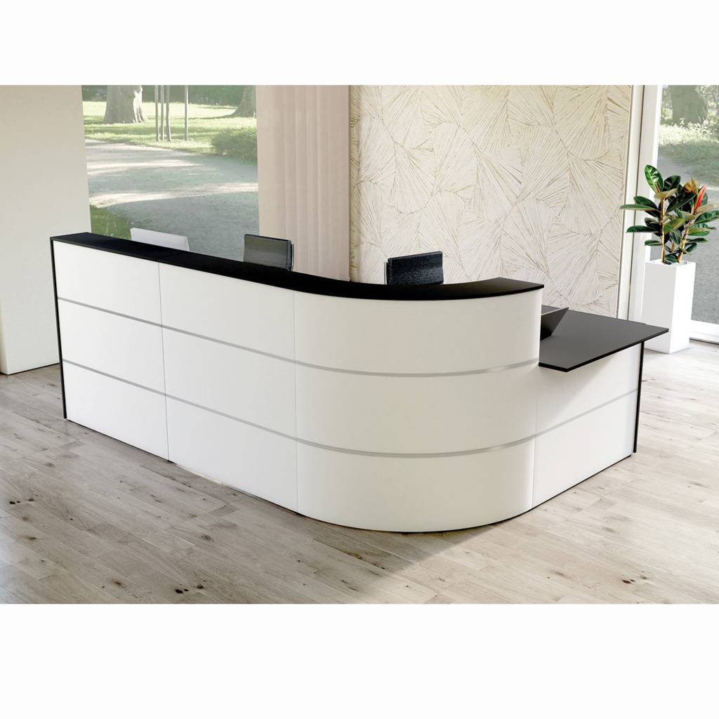 Empfangstheke Oveta mit Doppelarbeitsplatz | weiss/schwarz | Stahlgestell mit pulverbeschichtetem Stahlblech | Kabeldurchlass | versteckte