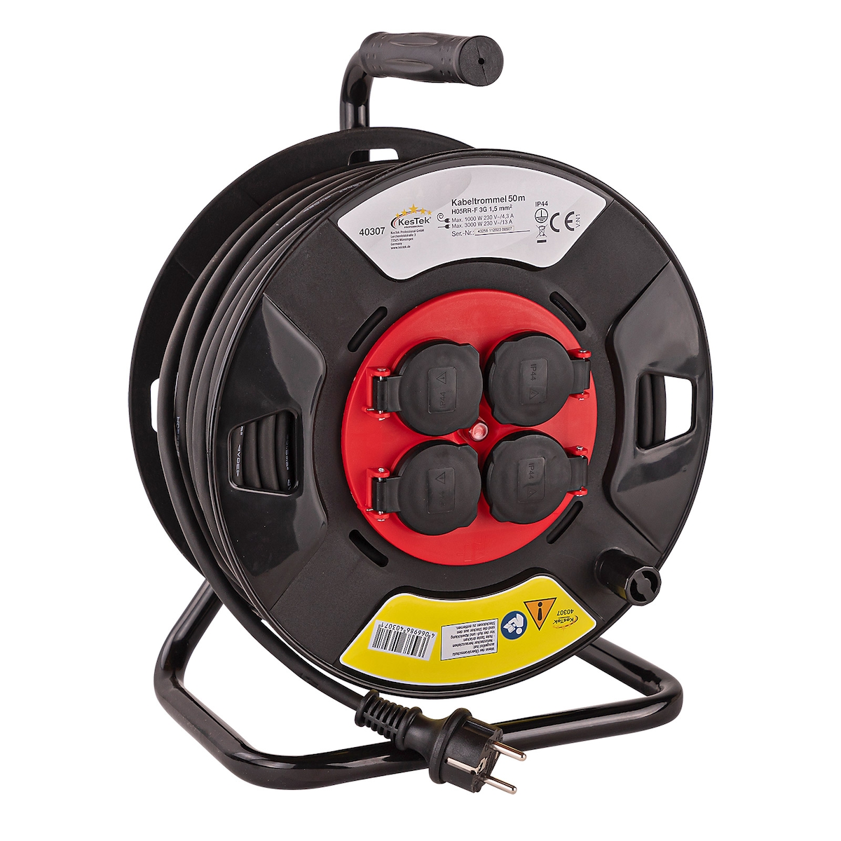 Kestek Kabeltrommel, Kabelrolle, 50m H05VV-F 3G1,5mm² Verlängerungskabel mit 4-fach Steckdose, IP20, robust, ideal für den Innenbereich und WerkstÃ