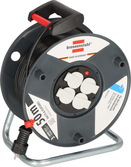 Brennenstuhl Kabeltrommel, 50m, 3x1,5mm, IP44, 3xSteckdosen, Mit thermischem Überlastschutz, Mit Tragerahmen