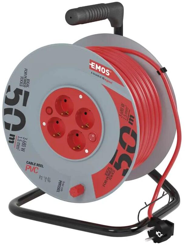 EMOS P092501 Kabeltrommel, SCHUKO, 4 Steckdosen, Länge 50m, 1,5mm², PVC, rot (1928045003)