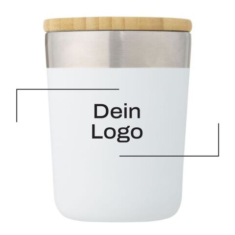 Werbeartikel 300 ml Vakuum-Thermobecher aus Edelstahl mit Bio-Bambusdeckel passend für Kaffeemaschinen – weiß – mit Logo bedruckt