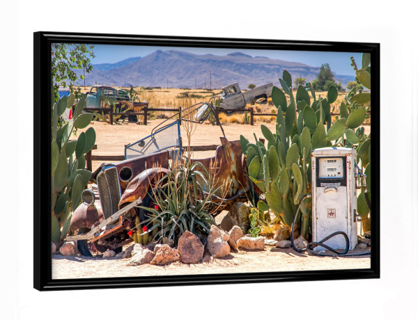 Poster mit schwarzem Rahmen "No petrol" artboxONE - Natur - Karre,Petrol,Tankstelle,Tanken,Wüste,Kaktus,Kakteen,Oldtimer