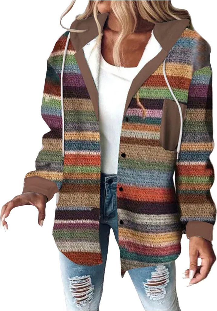 ASKSA Damen Winterjacke Karierte Hemdjacke Wolljacke Fleece Gefuettert Warme Kapuzenjacke Laessige Knopfleiste Jacke Mantel mit Taschen (Braun,XXL)
