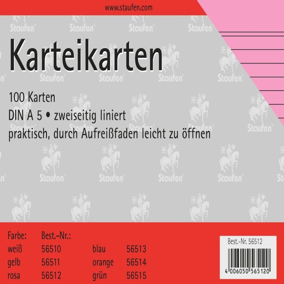 Staufen Karteikarten A5 180g/qm liniert rosa VE=10x100 Stück
