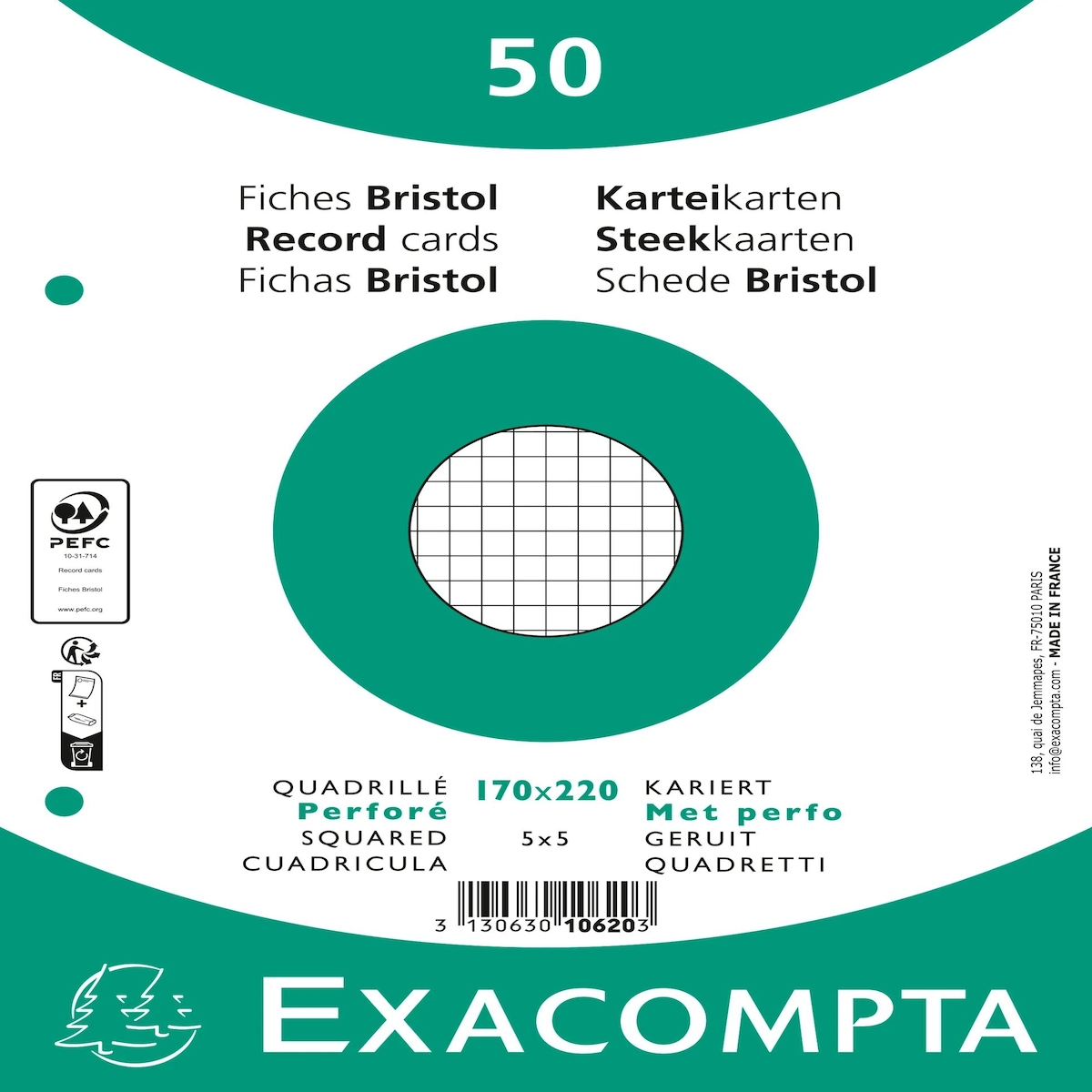 Exacompta 10620E 24x 100er Packung Karteikarten - kariert gelocht - 170x220mm - Weiß