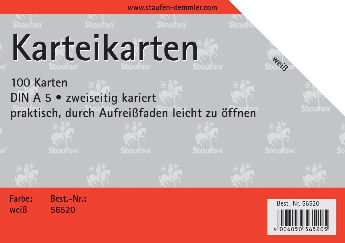 Staufen Karteikarten A5 kariert 180g/qm weiß VE=10x100 Stück