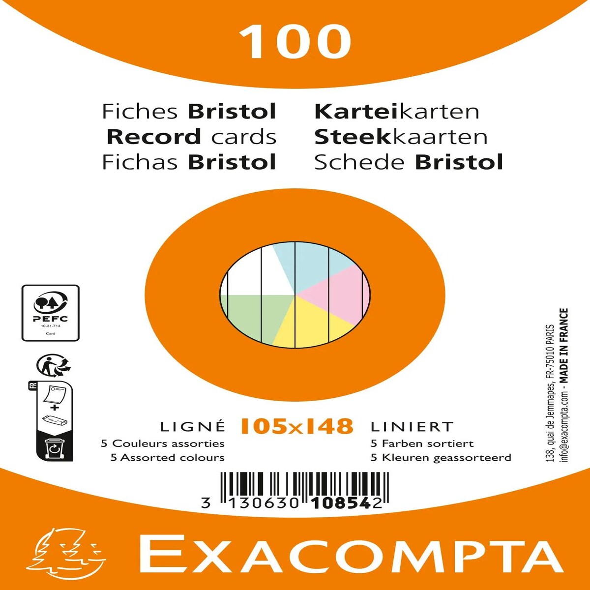 Exacompta 10854E 20x Karteikarten A6, Packung mit 100 Stück eingeschweißt, liniert, nicht gelocht, Farben sortiert - Farben sortiert