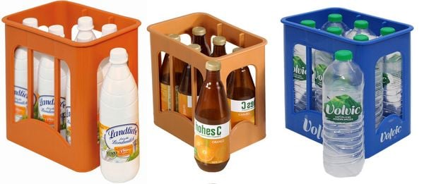 Kaufmannsladen Getränkekisten gefüllt mit jeweils 6 Flaschen Volvic, Hohes C oder Landliebe Milch