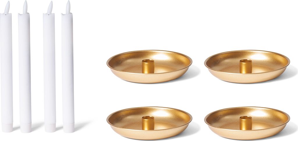 Novaliv Kerzenständer Stabkerzen 4er-Set GOLD 15cm Durchmesser mit LED-Kerze Premium batteriebetrieben Flackereffetkt elektrisch Adventskranz Kerz...
