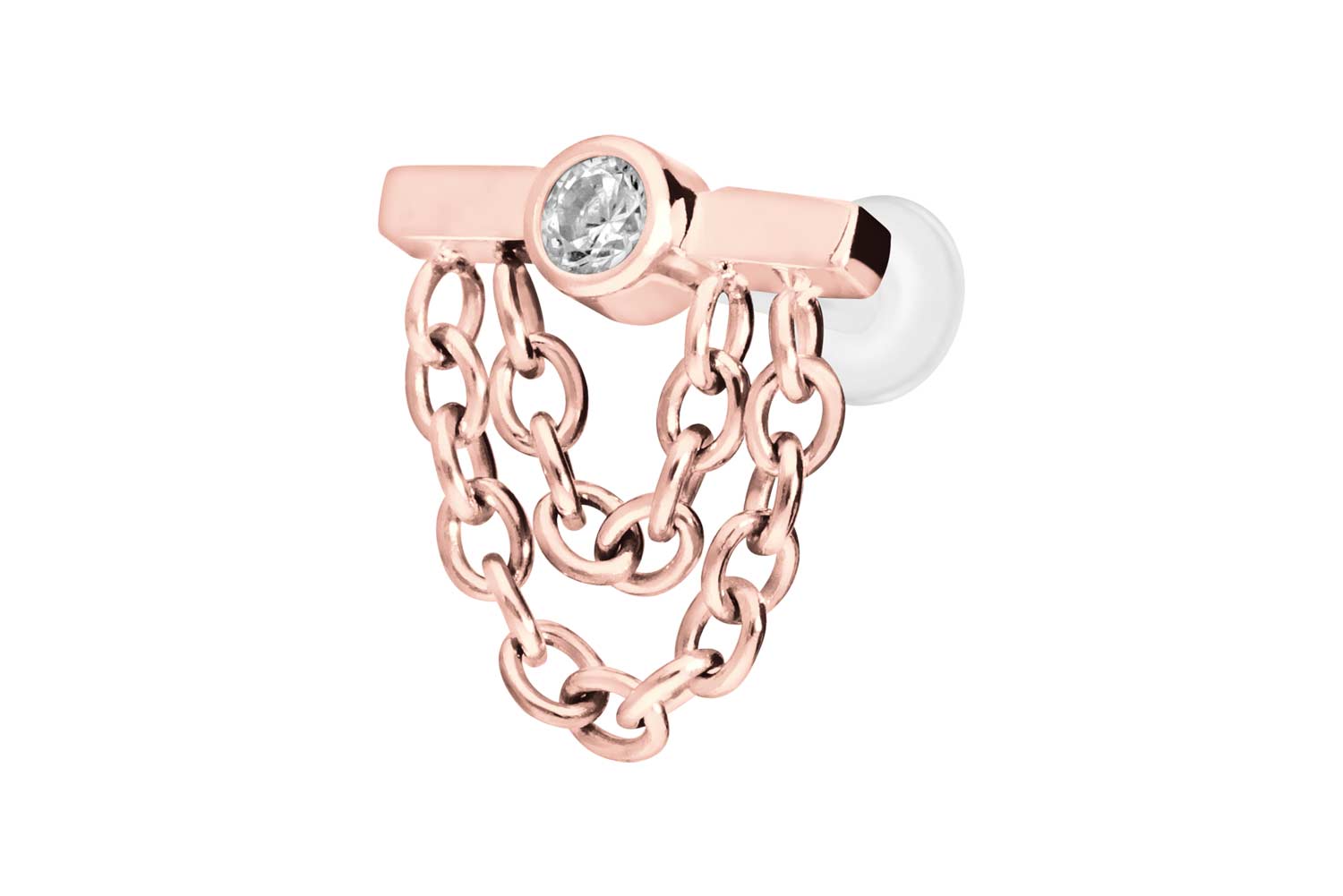 Ohrpiercing, Nasenpiercing PTFE Labret mit Innengewinde + Titan-Aufsatz BALKEN + KRISTALL + 2 KETTEN RoséGold Stablänge: 5mm | Stabstärke: 1,2mm