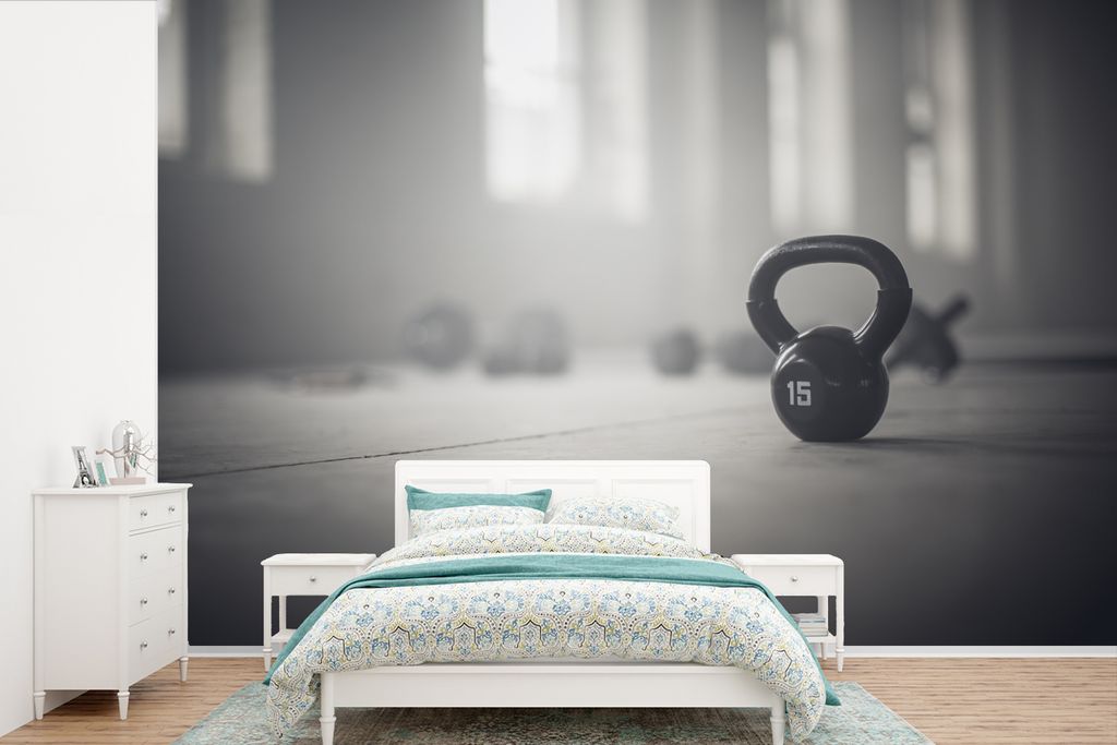 MuchoWow Fototapete für Wohnzimmer oder Schlafzimmer Wandtapete Vinyl Motivtapete Verschiedene Kettlebell-Gewichte auf dem Boden in einer Turnha...