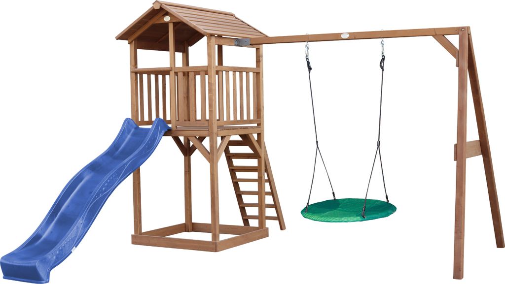 AXI Beach Tower Spielturm aus Holz in Braun | Spielhaus für Kinder mit blauer Rutsche, Nestschaukel und Sandkasten | Stelzenhaus für den Garten