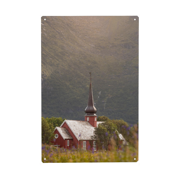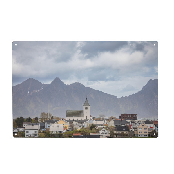 Metall Poster "Kirche in Norwegen" artboxONE - Reise,Architektur - Svolvaer,Svolvær kirke,Lofoten,Skandinavien,Norwegische küste,Berge - Blechschild