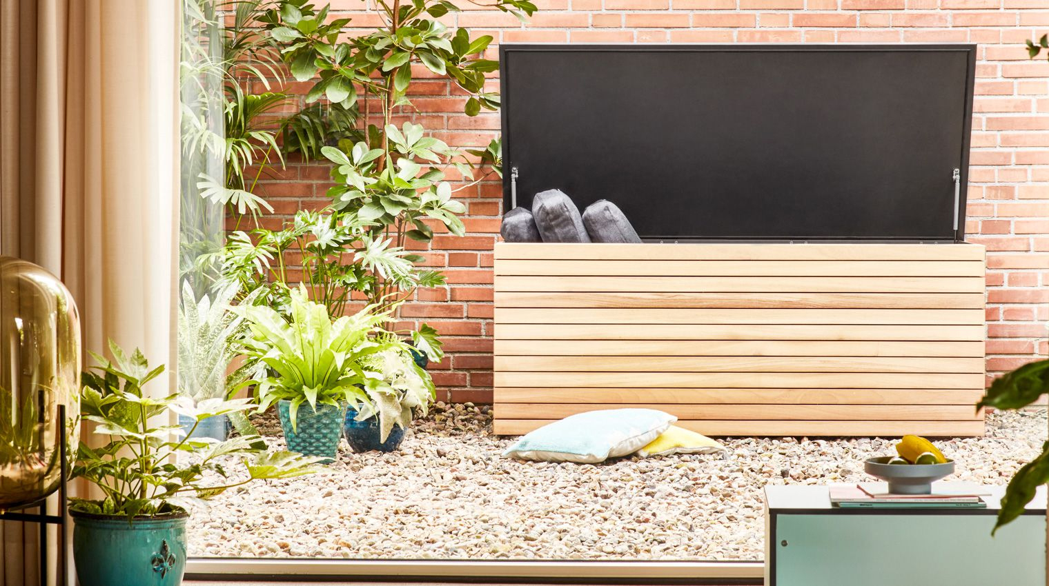 Auflagenbox Massive Premium Teak Kissentruhe 136 x 73 cm als exklusive Gartentruhe nachhaltige und unbehandelte Teak Kissenbox