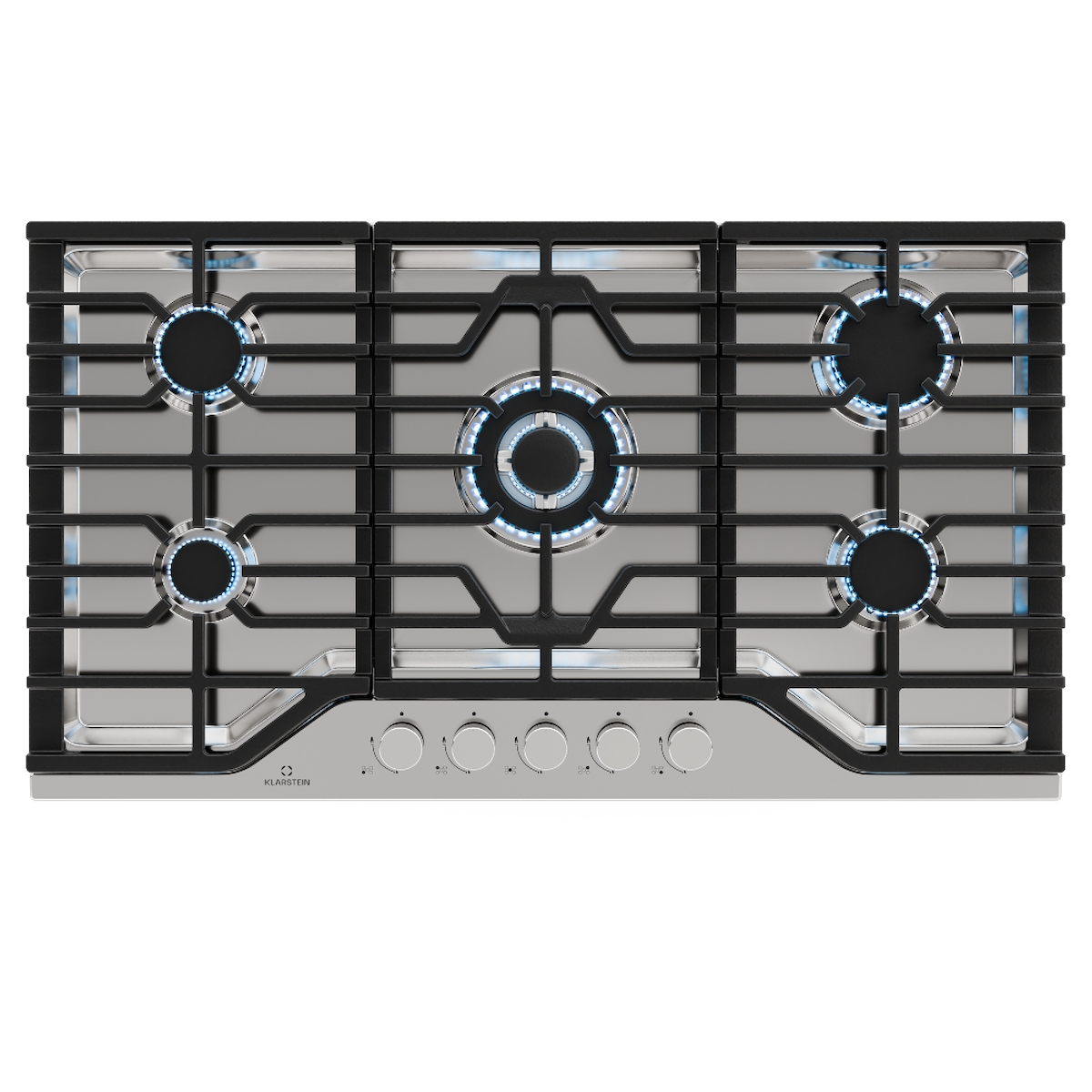 Klarstein Turbocast Gaskochfeld | 304er Edelstahl | 5 Brenner | Profi-Gusseisenhalter | Wok-Brenner Silber