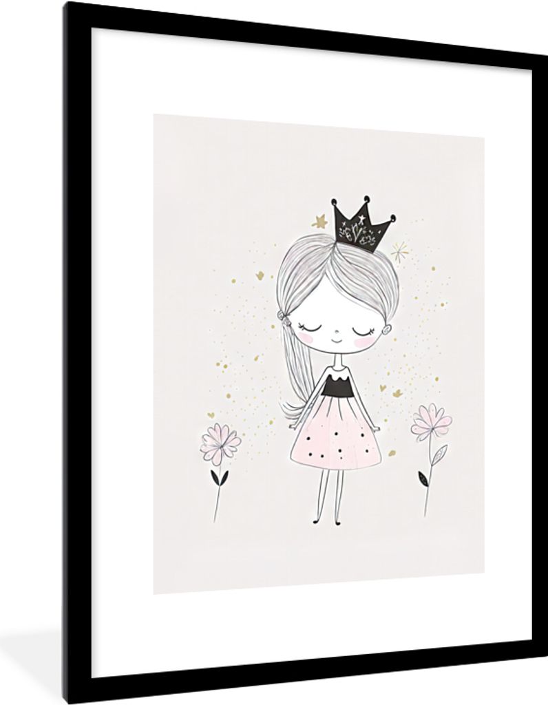 MuchoWow Gerahmtes Poster Prinzessin - Kleid - Krone - Blumen - Mädchen 60x80 cm - Poster mit Schwarzem Bilderrahmen Wandposter Rahmen Foto Bild...