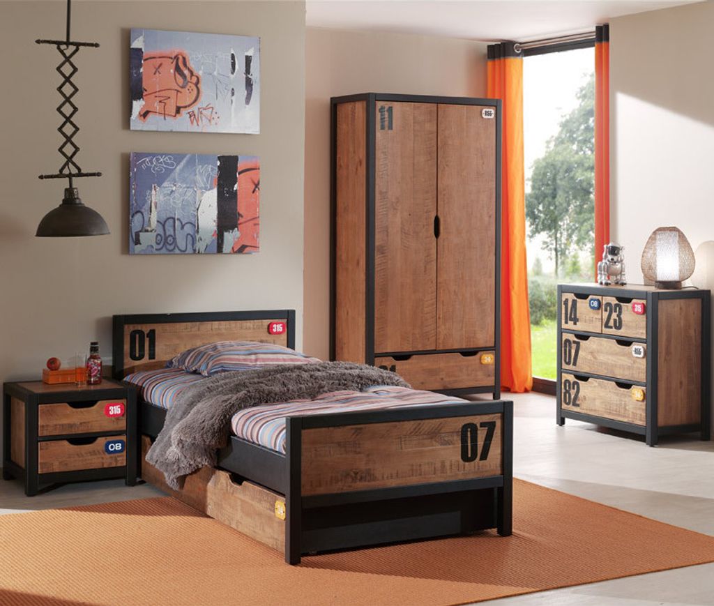 Jugendzimmer Set mit Einzelbett 90x200, Nachttisch, Bettschublade, Kleiderschrank 2-trg. und Kommode, CUSCO-12, Massiv cognacfarbig, schwarz, B x H...