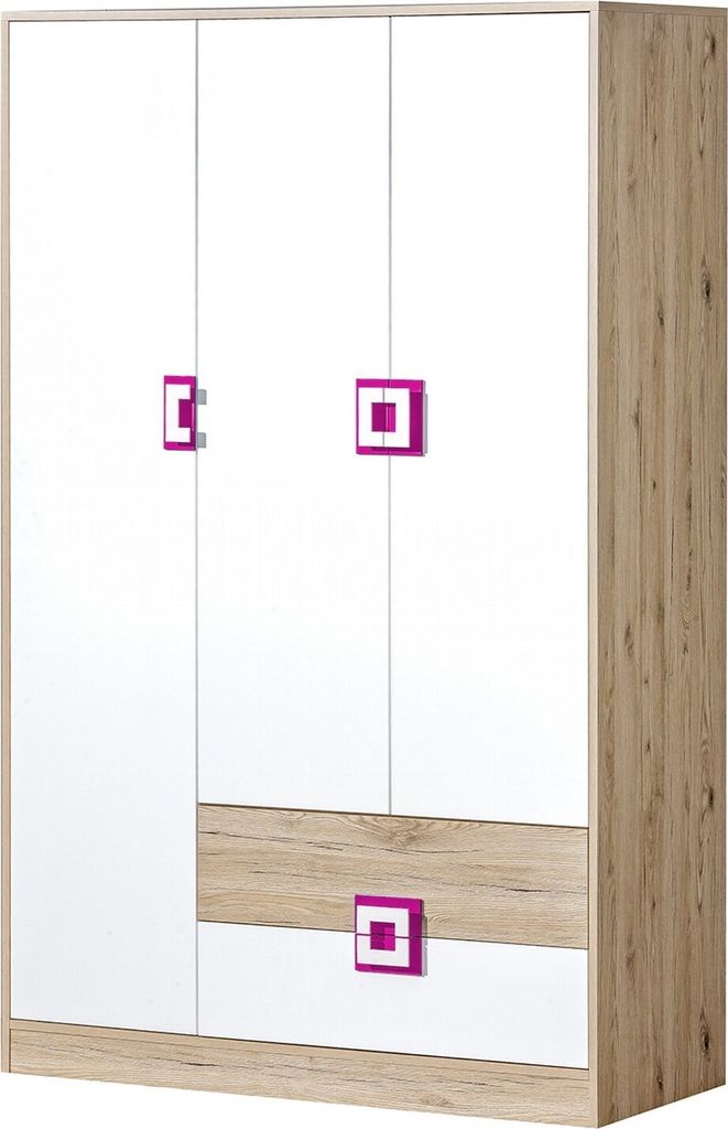 Furniture24 Kleiderschrank NICO 01, 3 Türiger Drehtürenschrank, Schrank mit 2 Schubfächern, 4 Einlegeboden und Kleiderstange Hell Eiche/Weiß/Rosa