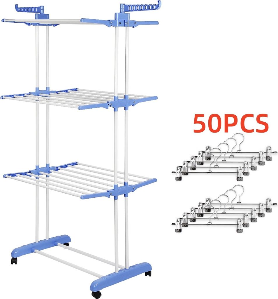Wäscheständer Wäschetrockner mit 50 Stück Metall Kleiderbügel Clip Kleiderständer auf Rollen 75x49x170cm
