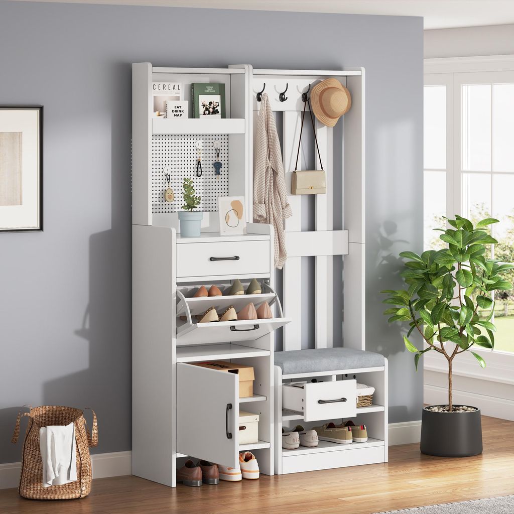 Merax Garderobenständer 7-in-1 mit Schuhbank und Stauraum, Kleiderständer 110x35x175,5cm mit 2 Schubladen,2 Schränken,7 Haken, Lochwand & Ablage...