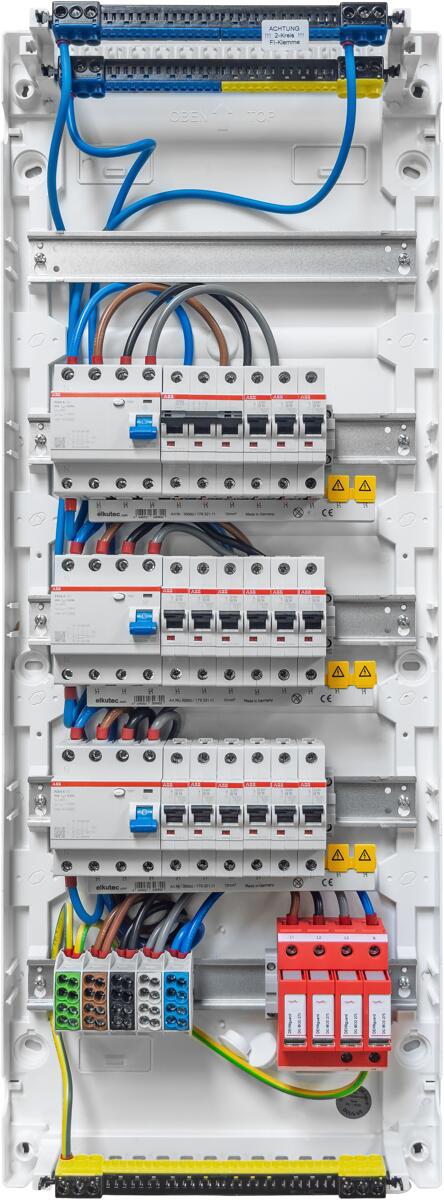 JÄGER AV4.1.09.1.2 Kleinverteiler, Aufputz, 4-reihig, bestückt und verdrahtet, 2 FI Schalter, Überspannungsableiter