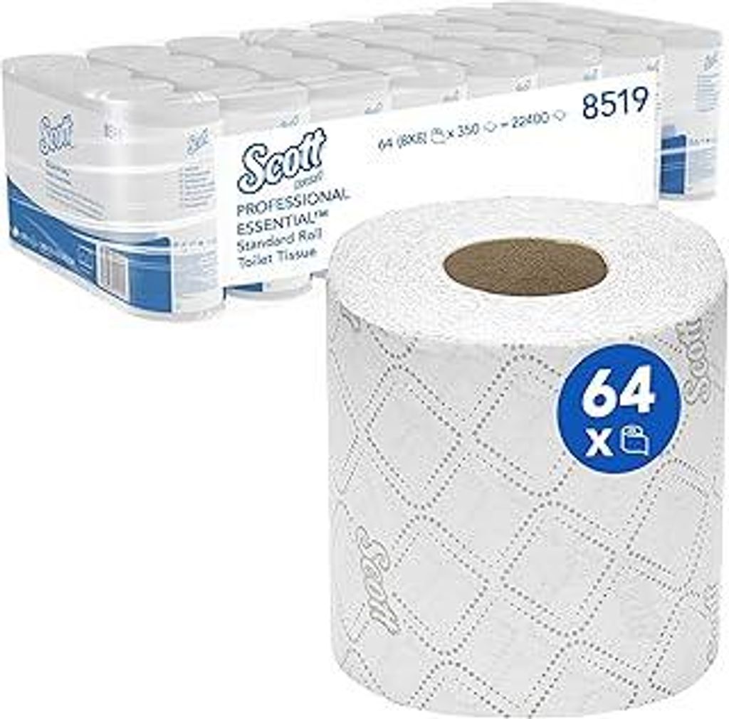 Scott Essential Toilettenpapier, weißes 2-lagiges Klopapier, und aus recycelten Fasern, 64 Toilettenpapierrollen x 350 Blätter (insg. 22.400 Blä...
