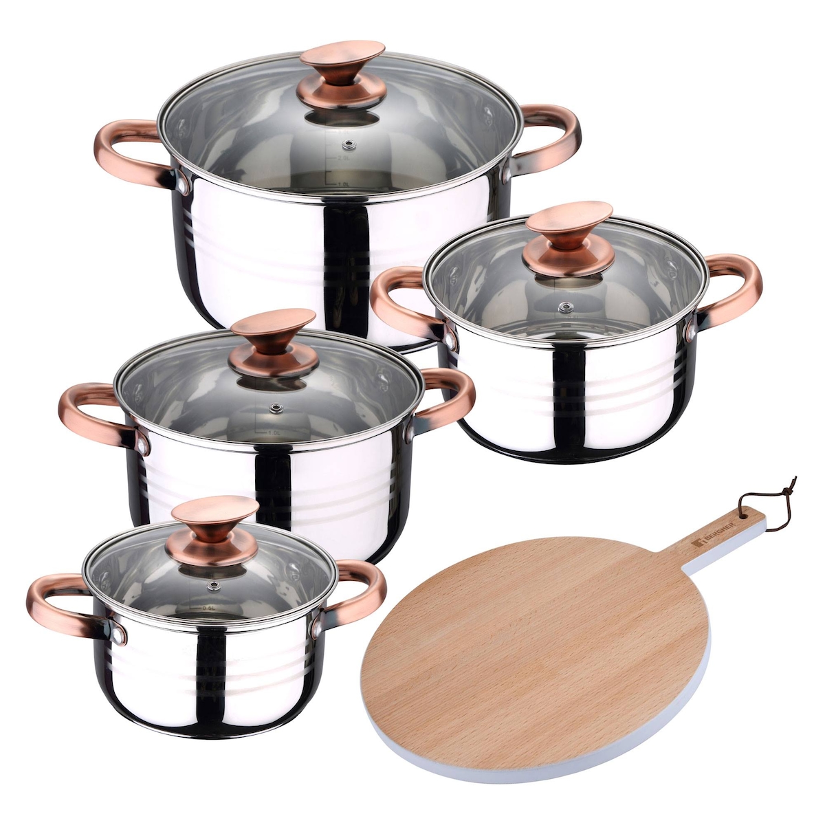 BERGNER - NONA 8-teiliges Kochgeschirr-Set (16/18/20/24cm) aus Edelstahl, induktions, mit einem runden Schneidebrett aus Buchenholz (38x28x1,5cm)