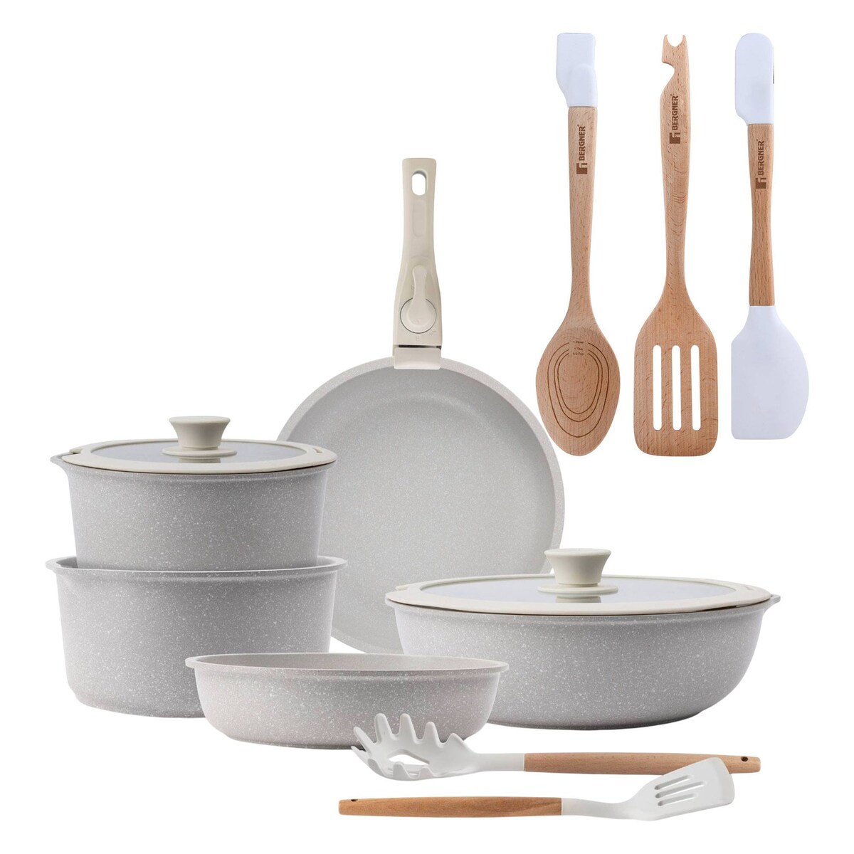 BERGNER - 10-teiliges Kochgeschirr-Set aus Aluminiumguss mit Antihaftbeschichtung, abnehmbaren Griffen und einem Set aus 3 Silikon- und Holzutensilien