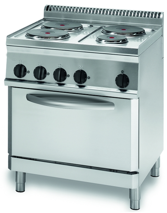 Professioneller Elektroherd mit 4 quadratischen Kochplatten und Elektrobackofen mit Umluft GN1/1, Tiefe 700 mm