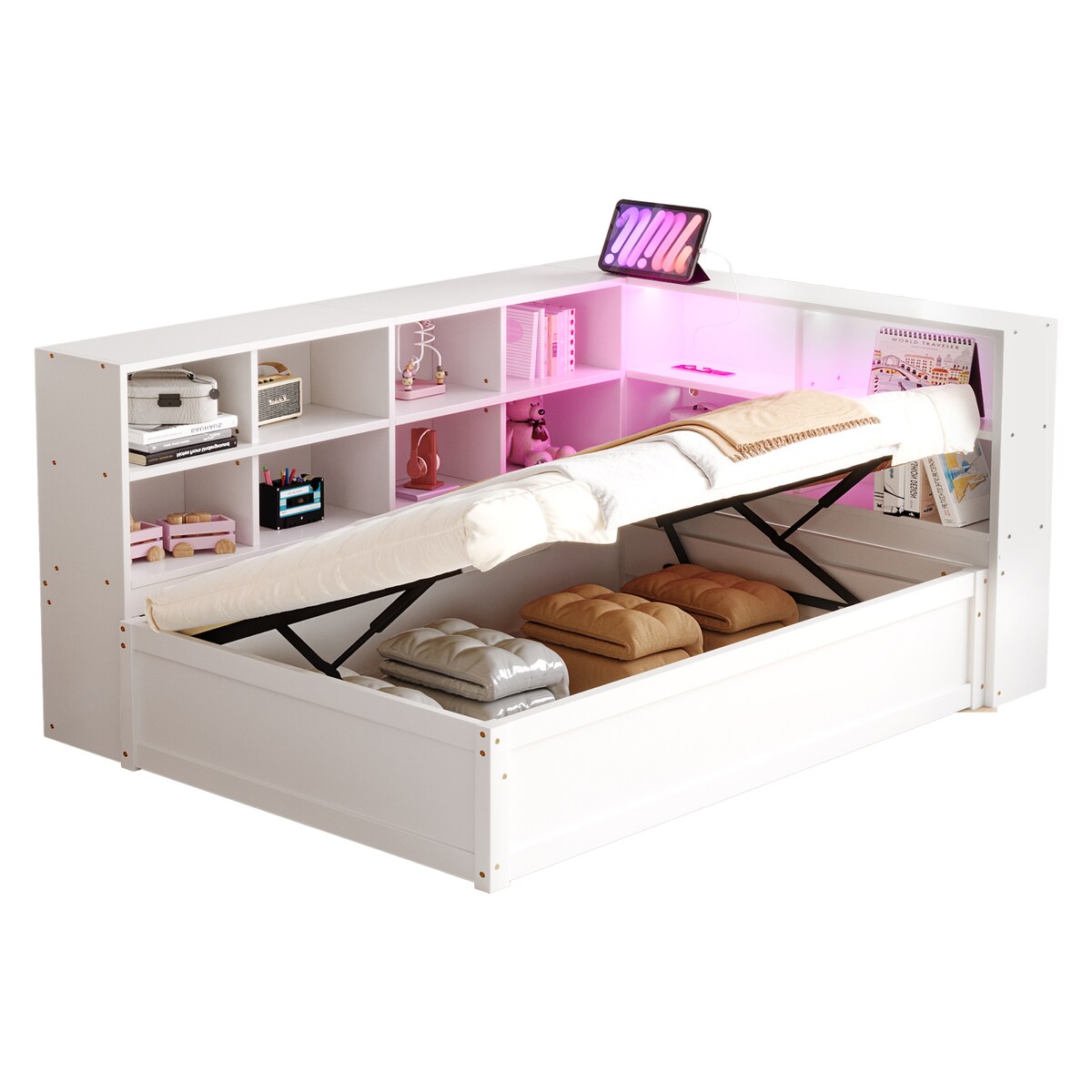 Polsterbett 90x200 cm mit Hydraulischem Stauraum, Nachtlicht, USB- und Typ-C-Ladeanschluss in Beige – Stilvolles Schlafsofa mit modernem Komfort