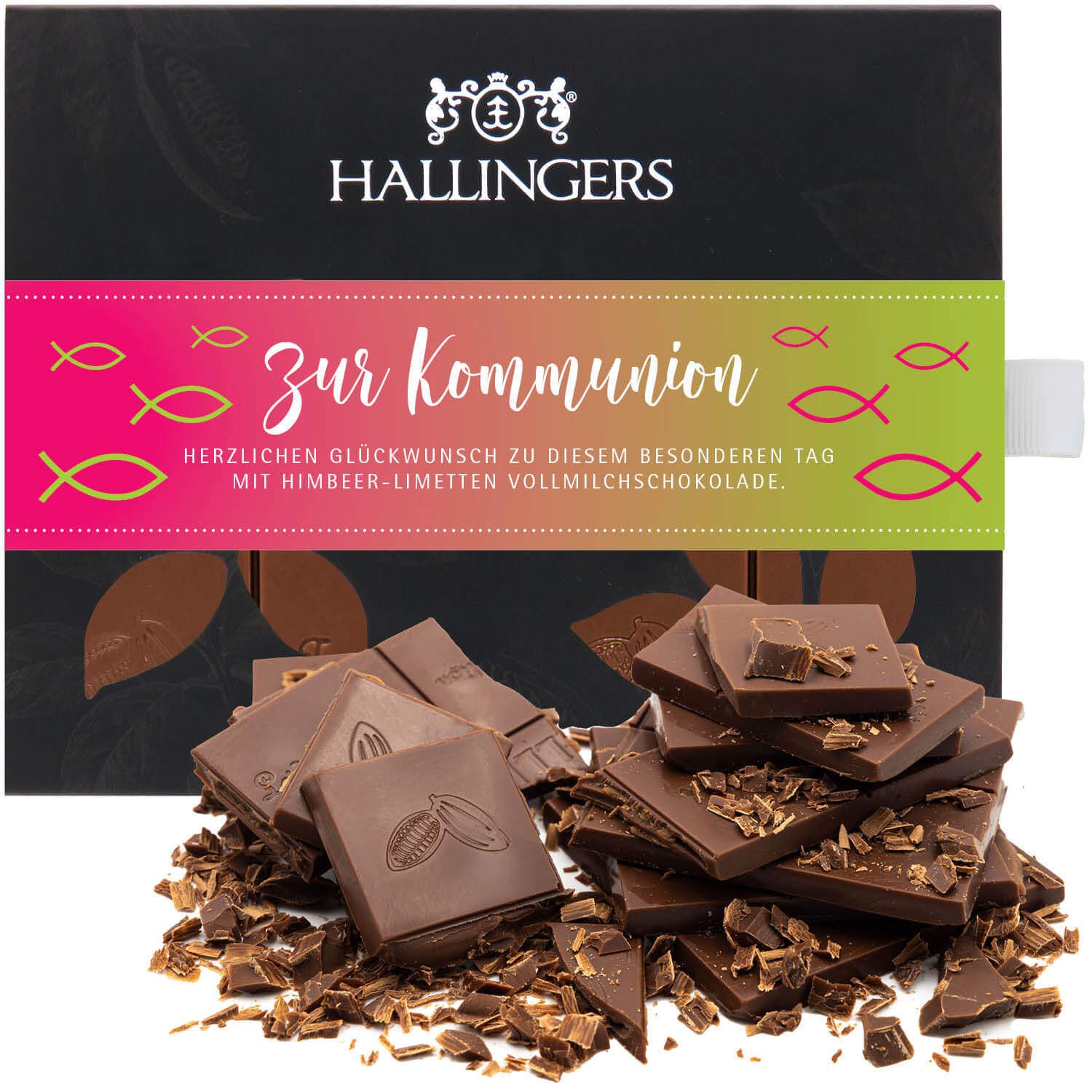 Schokoladen Geschenk - Tafel Vollmilch Edel-Kakao mit Himbeere & Limette - handmade ohne Alkohol, edle Geschenkverpackung "Zur Kommunion", genussvolle