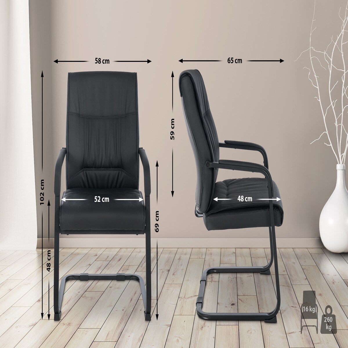 DELUKE XL Besucherstuhl MIAMI - Kunstleder Schwarz/schwarz 58x65x102 cm | Besucherstühle Konferenzstuhl Wartezimmerstuhl Bürostühle Bürostuhl