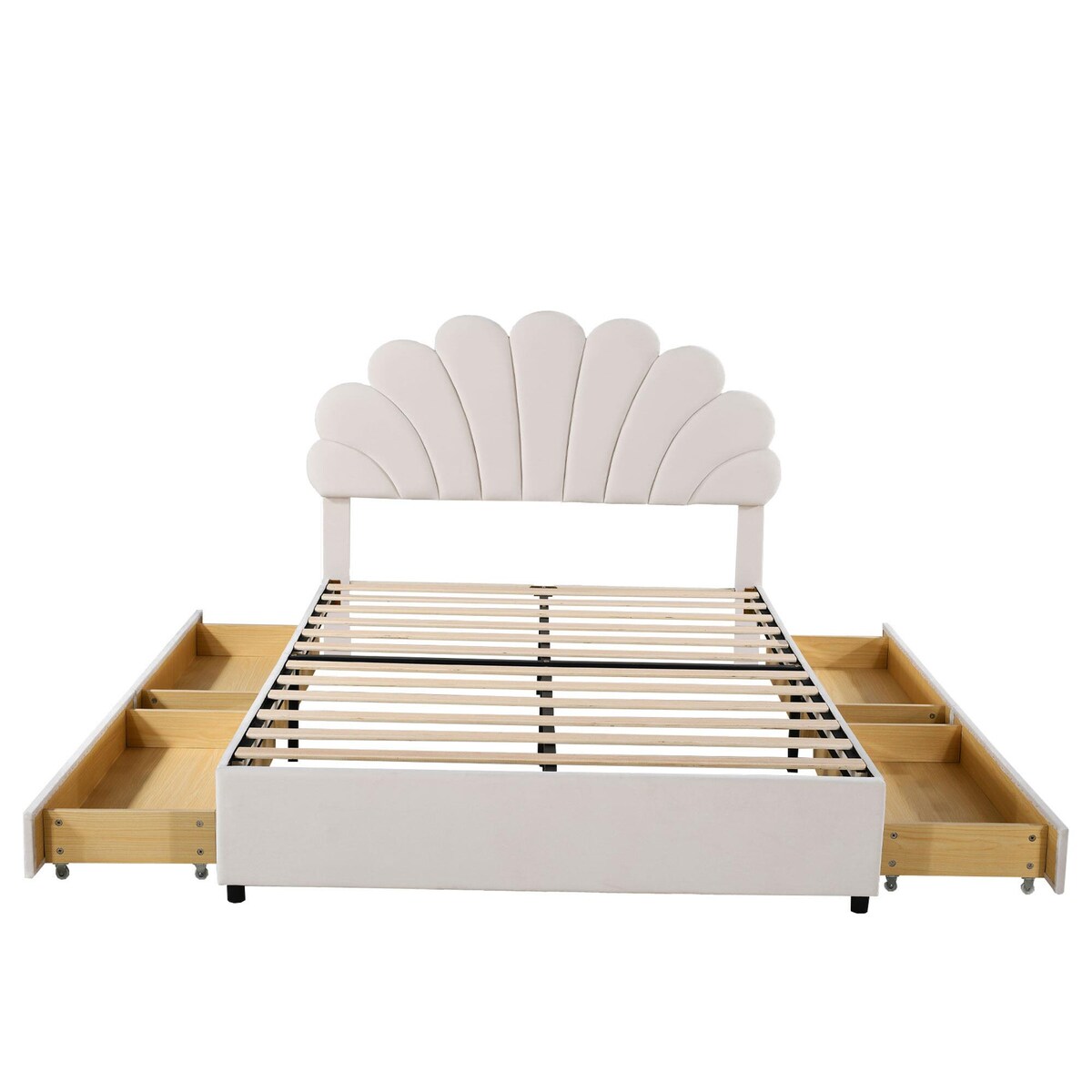 Polsterbett 140x200 cm mit Stauraum und blütenförmigem Kopfteil – stilvolles Design in Beige, 4 Schubladen für zusätzlichen Stauraum