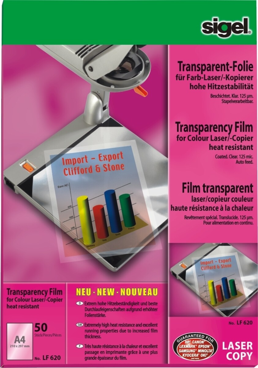 Sigel Farb-Laser/-Kopier-Folie transparent A4 125qm stapelverarbeitbar hohe Hitzestabilität VE=20 Blatt
