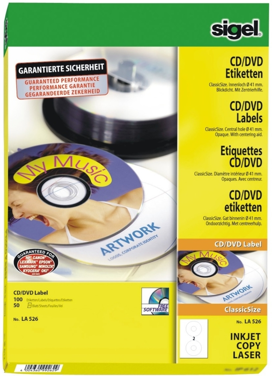 Sigel CD-/DVD-Etiketten Inkjet/Laser Kopier 117mm VE=10x50 Stück (25 Blatt) weiß