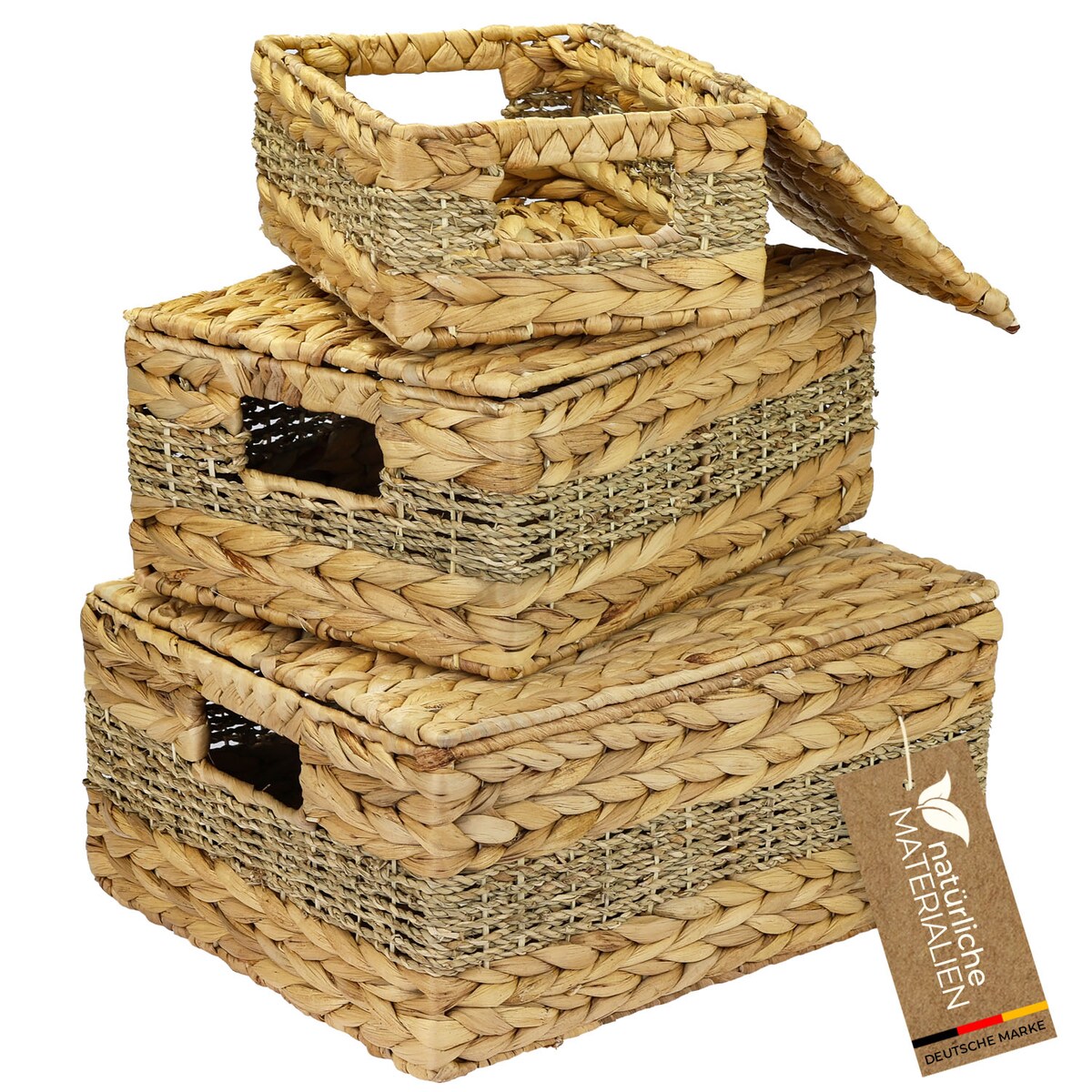 HMF Aufbewahrungskorb mit Deckel, 3er-Set, Korb geflochten aus Wasserhyazinthe und Seegras, Klein, Mittel, Groß