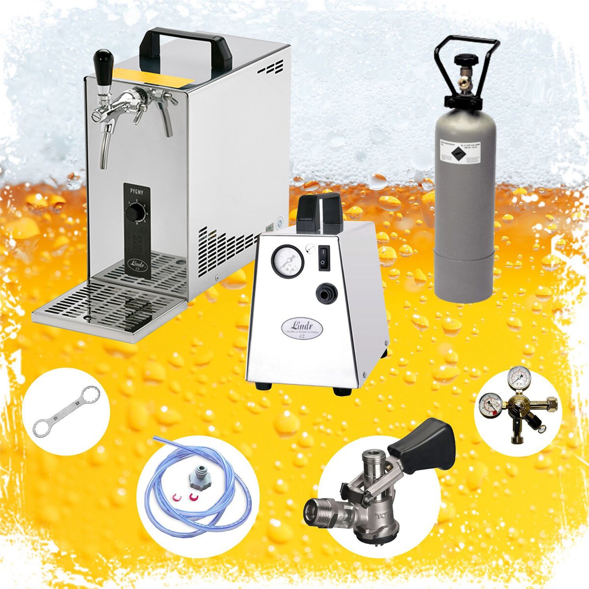 Komplett Set - Zapfanlage, Bierzapfanlage, Bierkoffer, Durchlaufkühler PYGMY 25 1-leitig Trockenkühler, 35 Liter/h, Zapfkopf:Korb