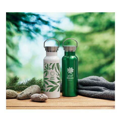 Werbeartikel Edelstahl Trinkflasche 500 ml doppelwandig recycelt Korkboden Henkeldeckel BPA-frei auslaufsicher im Kannenlook – grün – mit Logo
