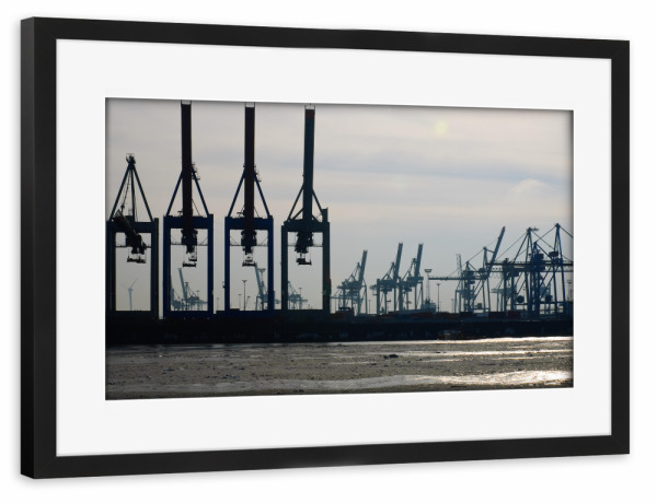 Poster mit Rahmen schwarz "Kranlandschaft" artboxONE - Städte / Hamburg - Transport,Hafen,Verladen,Hamburg hafen,Container,Kran
