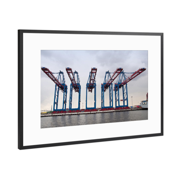 Poster mit Rahmen Schwarz (Metallic) "Five Cranes" artboxONE - Städte / Hamburg - Transport,Hafen,Verladen,Hamburg hafen,Container,Kran
