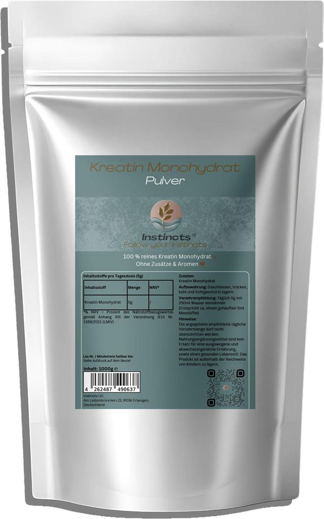 INSTINCTS, Kreatin Monohydrat - 1000g Doypack, 100 % reines Kreatin Monohydrat | Ohne Zusätzen & Aromen
