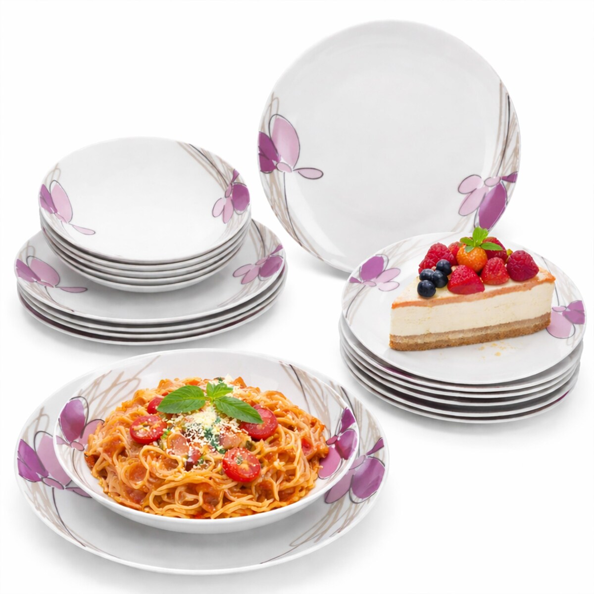 Viola 18tlg Tellerset Porzellan Weiß Violett Blumen Speise Suppen Kuchenteller