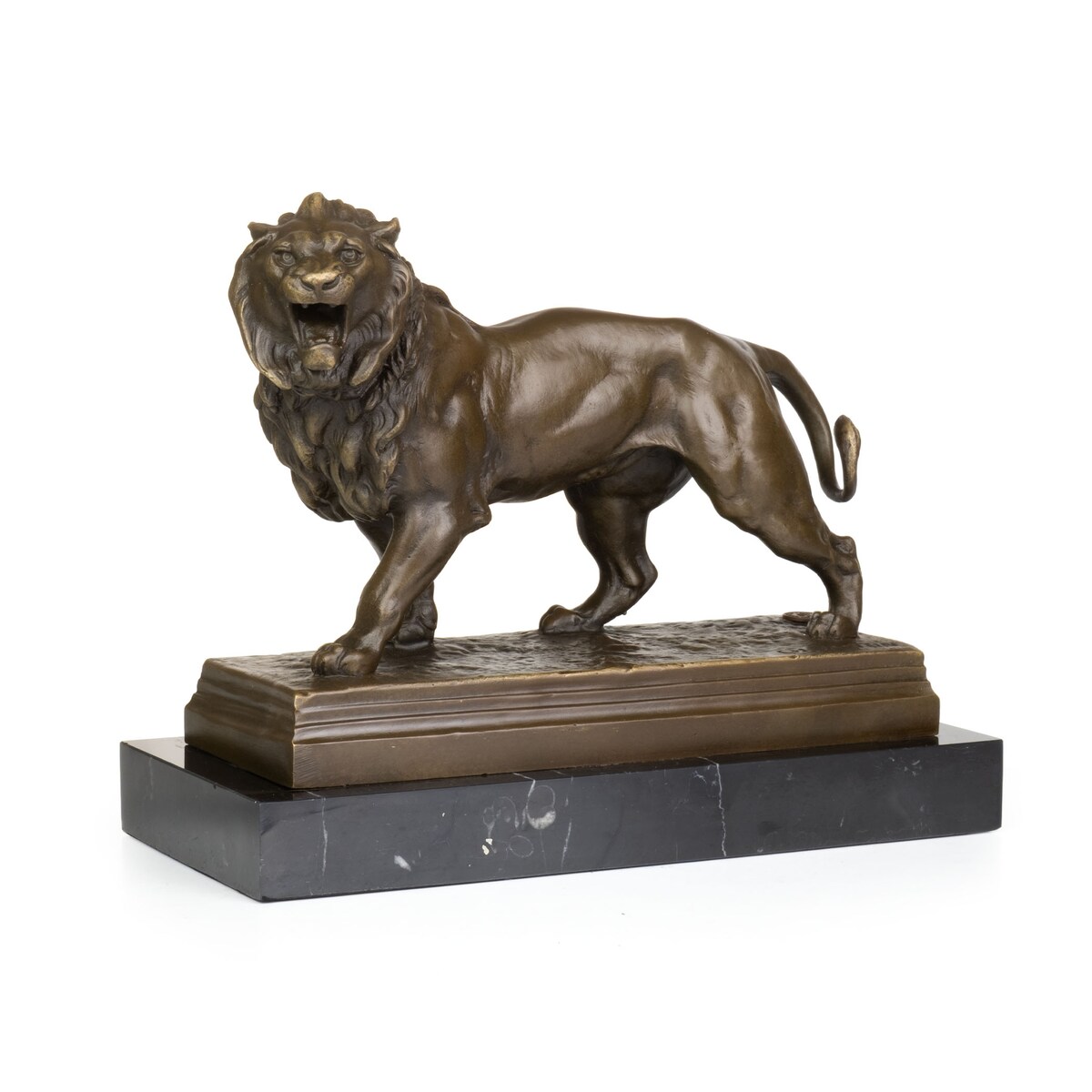 Bronzeskulptur Löwe stehend aus Bronze auf Marmorsockel mit Filz H 20,2 cm plastische Tierfigur als Kunstobjekt für Wohnraum Innenbereich