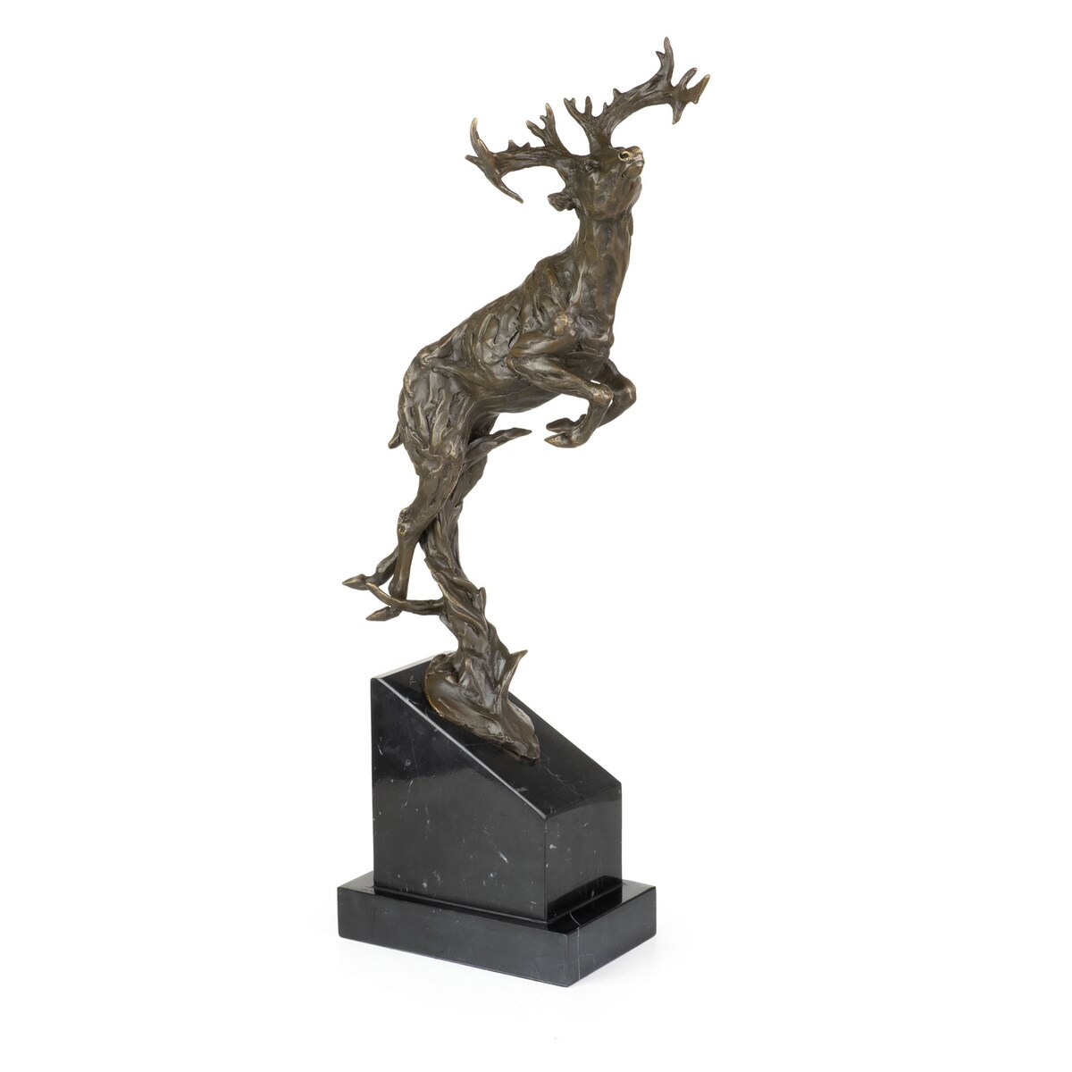 Bronzeskulptur röhrender Hirsch aus Bronze auf Marmorsockel 52 cm plastische Tierfigur mit detailreicher Ausarbeitung als Kunstobjekt für Wohnraum