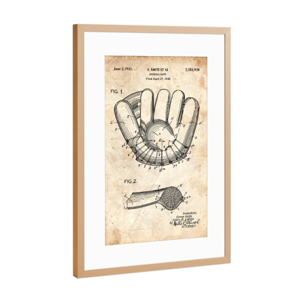 Poster mit Rahmen Kupfer "Baseballhandschuh II (Antik)" artboxONE - Sport - Sport,Baseball,Vintage,Retro,Patent,Blaupause,Entwurf,Usa,Fitness,America
