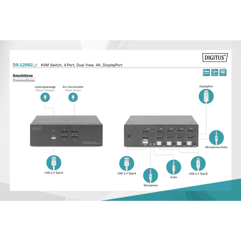 DIGITUS KVM-Switch 4-Port 4K60Hz, 4xDP in, 1xDP/HDMI out