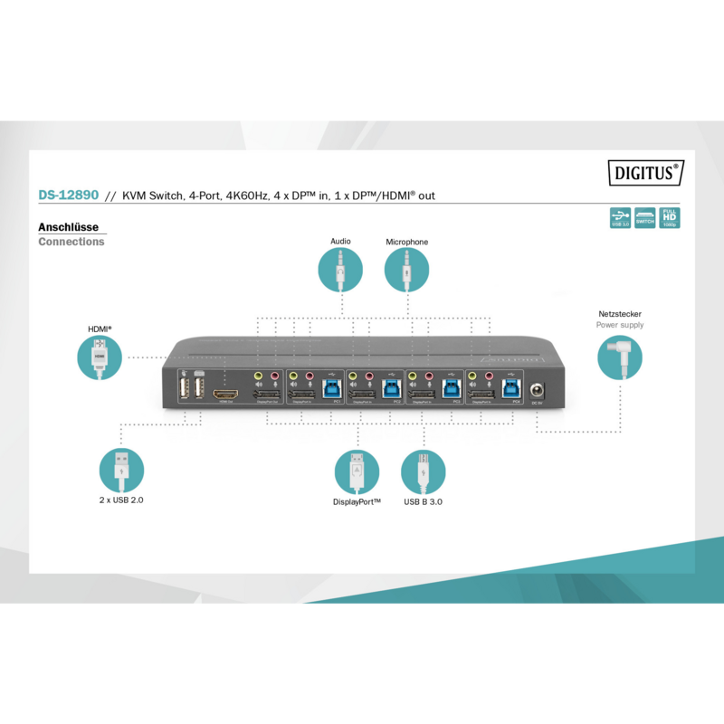 Digitus KVM Switch DisplayPort 4 Port KVM-Switch, 4K60Hz, 4 x DP in, 1 x DP/HDMI