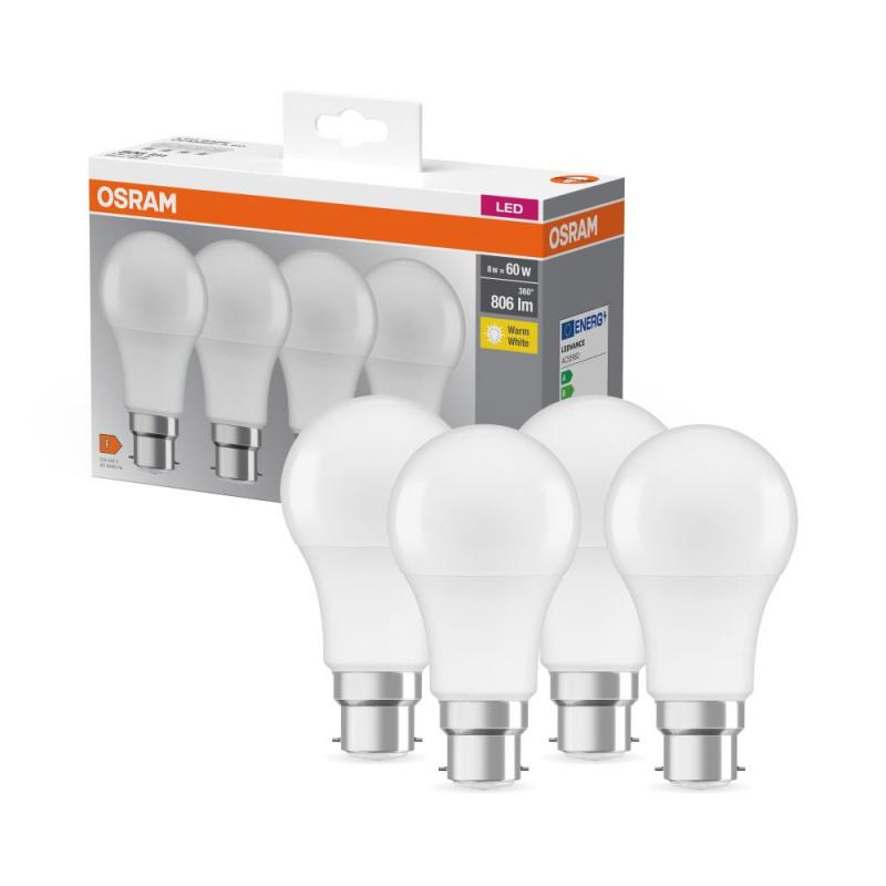 4er Pack OSRAM LED Lampe BASE B22d Bajonettsockel Glühbirne 8,5W wie 60W warmweißes Licht - mattiertes Glas, EEK: F (Spektrum: A bis G)