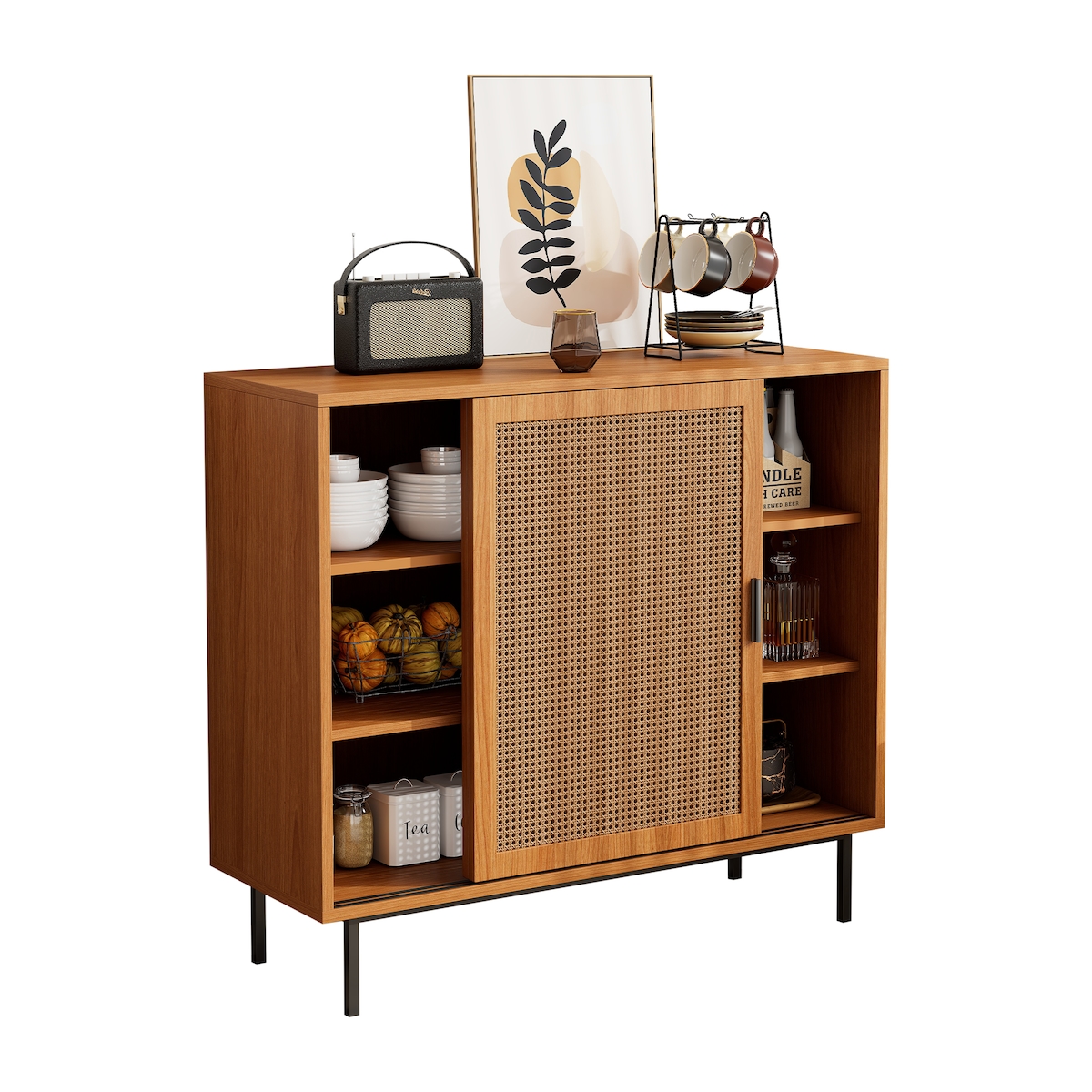 Sideboard 100x90x37 cm Walnuss Landhausstil 2 Schiebetüren Rattan verstellbares Regal Holz Wohnzimmer Esszimmer Kommode