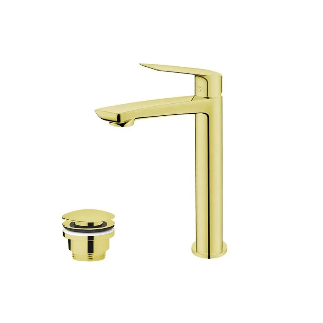 TRIZERATOP Miscelatore lavabo con bocca alta e piletta di scarico (tappo) oro